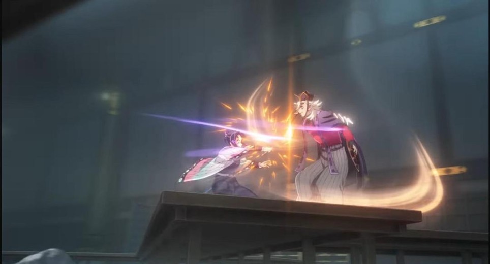師徒對戰三哥的組合戰鬥,結合無限城廣闊無邊的地域設定,著實將對戰場面施展到最大化。三哥與義勇的首次交鋒,在拳腳與刀劍的撞擊中,配合彼此不斷變化的招式,以及梶浦由記的鋼琴伴奏配樂,在3D無限城場景變化中結合傳統2D打鬥,明顯能感受到幽浮社使出洪荒之力精益求精,將團隊逼到極限試圖給觀眾精彩絕倫的戰鬥過程,是首部曲最能凸顯動畫製作高難之處,也是技術面上最能吹的段落,同時也將富岡義勇的帥氣發揮到淋漓盡致,是目前鬼滅動畫出到現在,最能體現義勇魅力的一次,IMAX廳看著實酣暢淋漓。