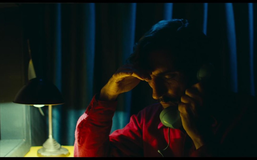 以及对框中框的应用,镜头框之下的另一个框架,这样的镜头设计在影片里设计地很有意味。画面保持理性美感,提升人物塑造的效率,构筑起人物间的隐形关系,这类镜头设计太过于精巧,难度也颇高,对导演的空间感与想象力有着极大考验。 电话戏同样也是一种框中框,这两段戏设置在一家提供色情服务的酒吧,男人走进不同场景主题的小隔间,遇见单面镜后散发着不同风情的女人,他们聊天喝酒,他们释放野性,尽管女人看不见男人,男人对不准女人的眼神。其实追本溯源,镜面拍摄手法的推广始于《天国与地狱》,诸多后来者进行效仿或元素借鉴,但都难以逾越这座最高的山,而《德州巴黎》中的镜面戏是我心目中最能比肩前者的另一高峰。